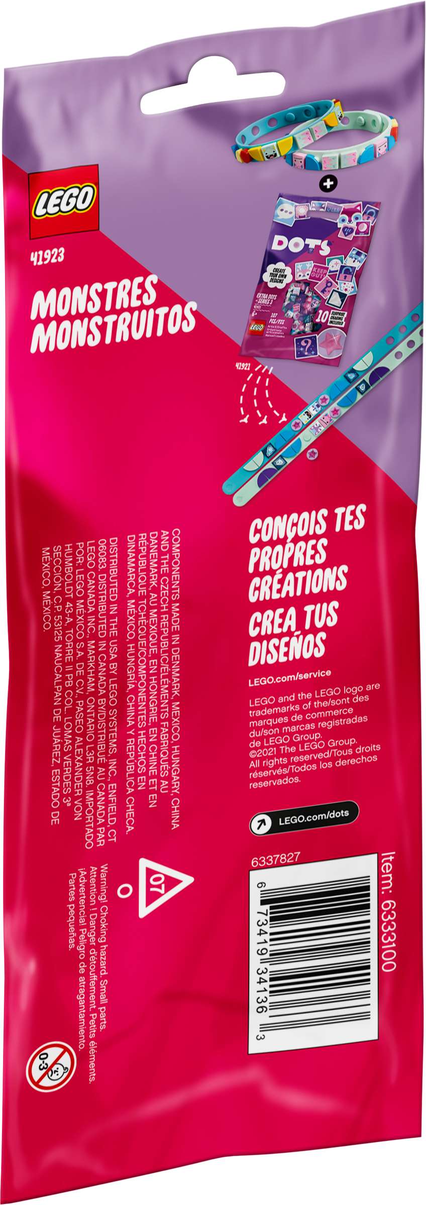 LEGO 41923 Monster Bracelets is a 34 piece Dots set released in 2021. It features two adjustable bands in mint and blue, along with 32 colorful tiles decorated with monster designs, allowing for customizable bracelets.